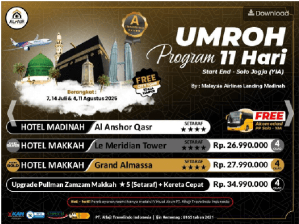 PAKET UMROH 14 JULI 2025 11 D BY MALAYSIA AIRLINES - GOLD
